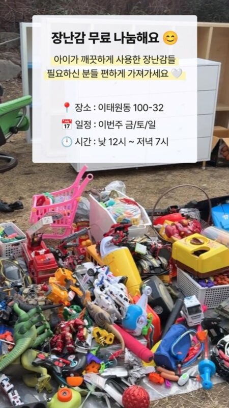 ファン・ジョンウムによると、おもちゃの無料配布場所は、イテウォン(梨泰院)洞100-32で、日程は、今週の金・土・日曜日。