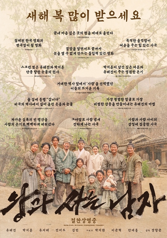 公開された「王と生きる男」のレビュー・ポスターには、明るくほほ笑むクァンチョンゴルの村長オム・フンド(ユ・ヘジン)、村人たちと打ち解けて笑っている幼い先王イ・ホンウィ(パク・ジフン)と宮女メファ(チョン・ミド)、フンドの息子テサン(キム・ミン)の姿が収められ、心に温かい余韻を与える。