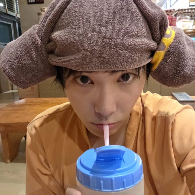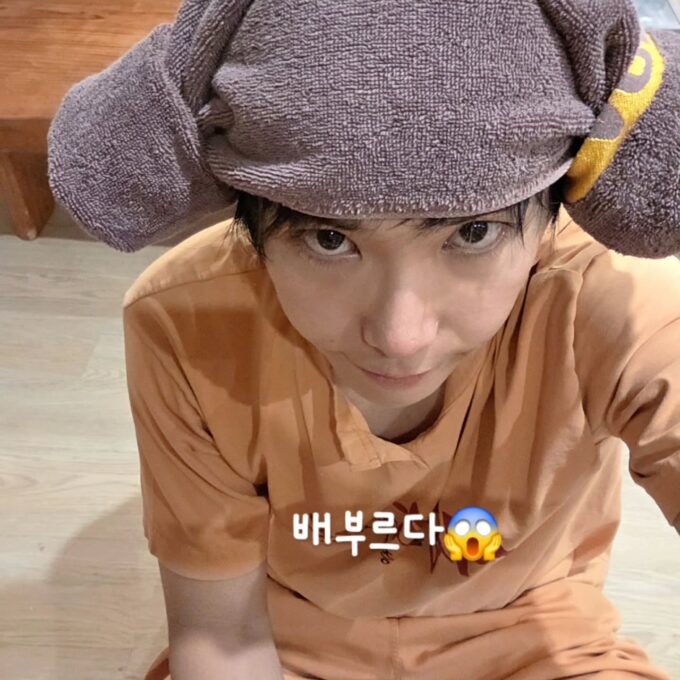 ホンギはチムジルバンに行った様子で、素顔で飲み物を飲んでいる。お腹いっぱい食べたようで、写真には「お腹いっぱい」というフレーズが加えられている。