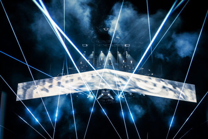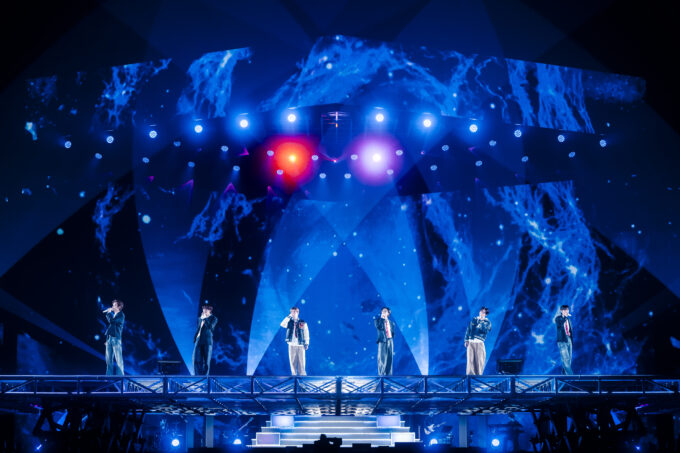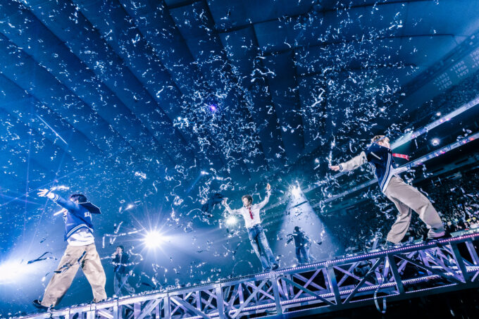 映像を挟んで、メンバーがブルーベースのカジュアルな衣装に着替えると、ライブは後半戦へ。彼らの代表曲が並ぶ、盛り上がり必至のゾーンに突入する。「Get A Guitar」では間奏のダンスパートをアレンジ。いつもにも増して華麗なショウタロウのターンに観客も沸いた。「Boom Boom Bass」は移動するステージの上で披露。不安定な土台をものともしない完ぺきなパフォーマンスで、コールを入れるBRIIZEの声も一層、熱を増した。「Fly Up」ではアリーナ中間地点の花道に散らばり、多くのダンサーを従え、迫力満点のステージ。銀テープも放たれ、後半戦1回目の頂点を迎えた。