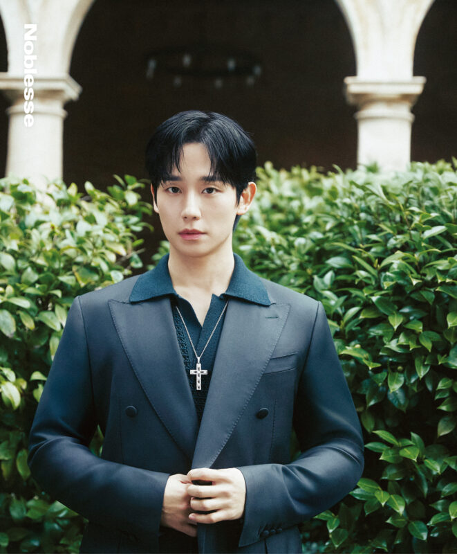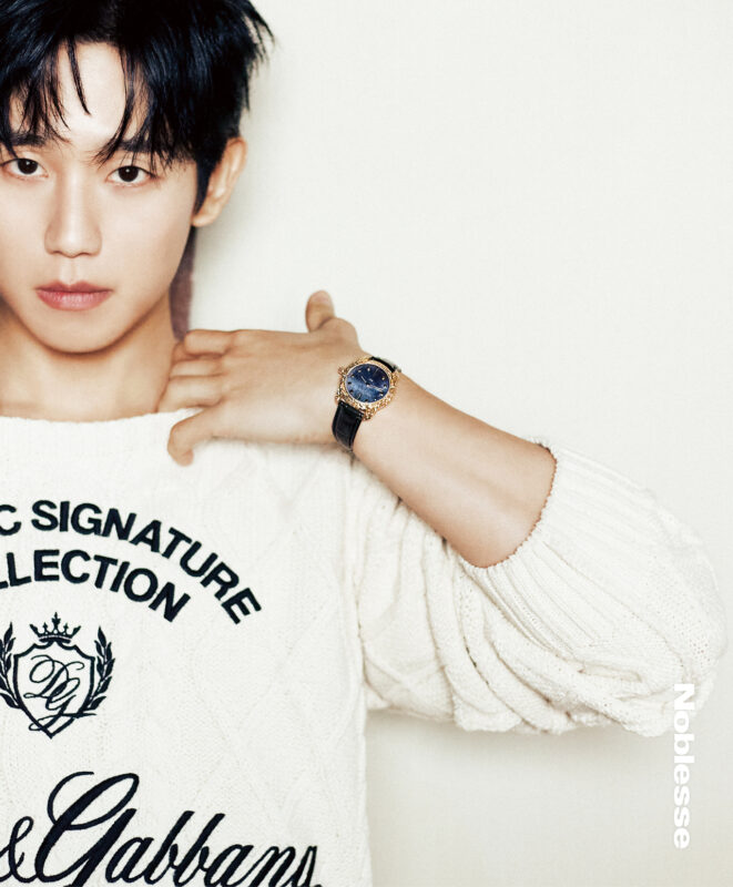 ベルベットとシルク素材のスーツは、彼の頼もしい雰囲気と相まって、より立体的に輝いた。構造的なラペルと柔らかなシルエット、クリスタルを連想させるボタンのディテールは、チョン・ヘインの繊細なジェスチャーと調和し、ほのかな存在感を放っている。