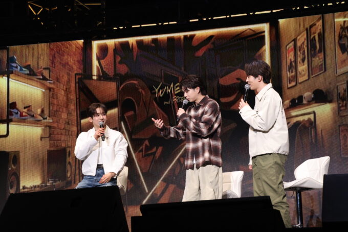 グローバルな「師弟・戦友」とのトークコーナーに続いては、現在人気爆発中の5人組ダンスボーカルグループM!LKから塩﨑太智と吉田仁人が登場。M!LKの「Kiss Plan」をYUMEKIが振り付けしたということで、初めて会う前はYUMEKIのことを少し怖い人だと思っていたことや、練習時でもYUMEKIのファッションがとてもおしゃれだったことなど、「Kiss Plan」の振り付けレッスンが1日しかなかったことなど秘蔵トークが飛び出しました。