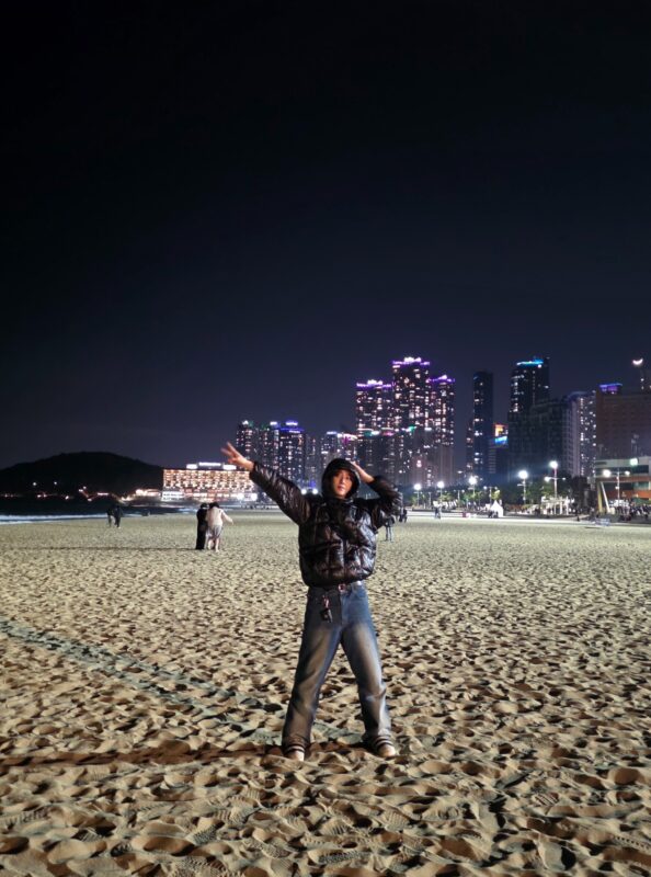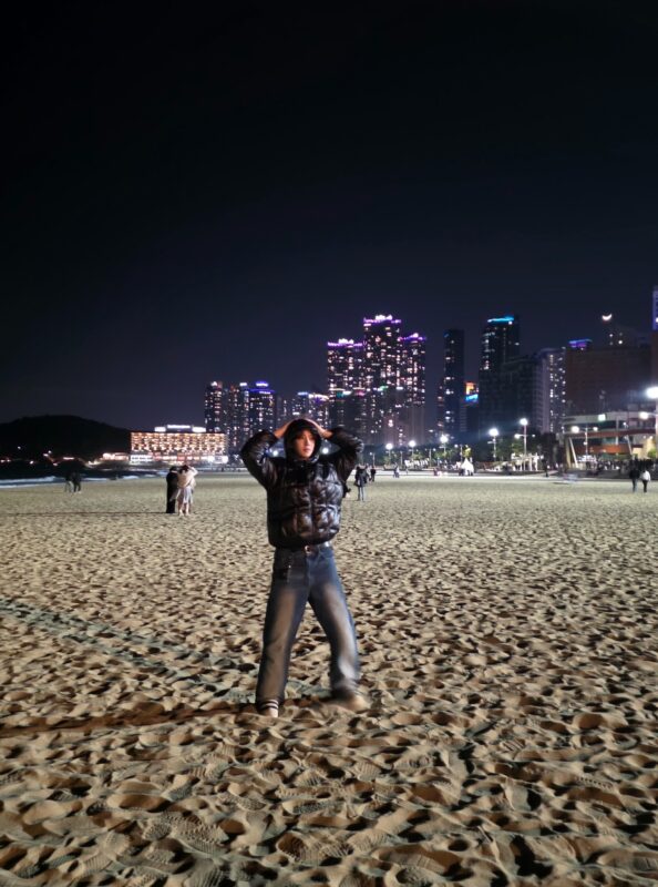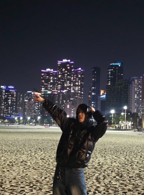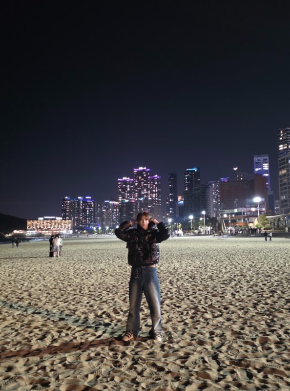 カズタは、高層ビルのライトが輝く夜の砂浜でカメラに向かってはつらつとしたポーズを取っている。