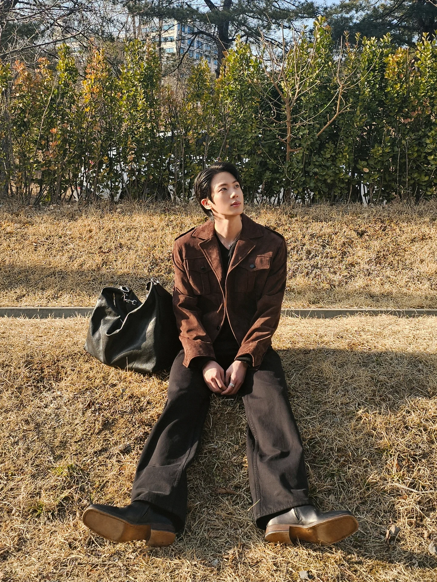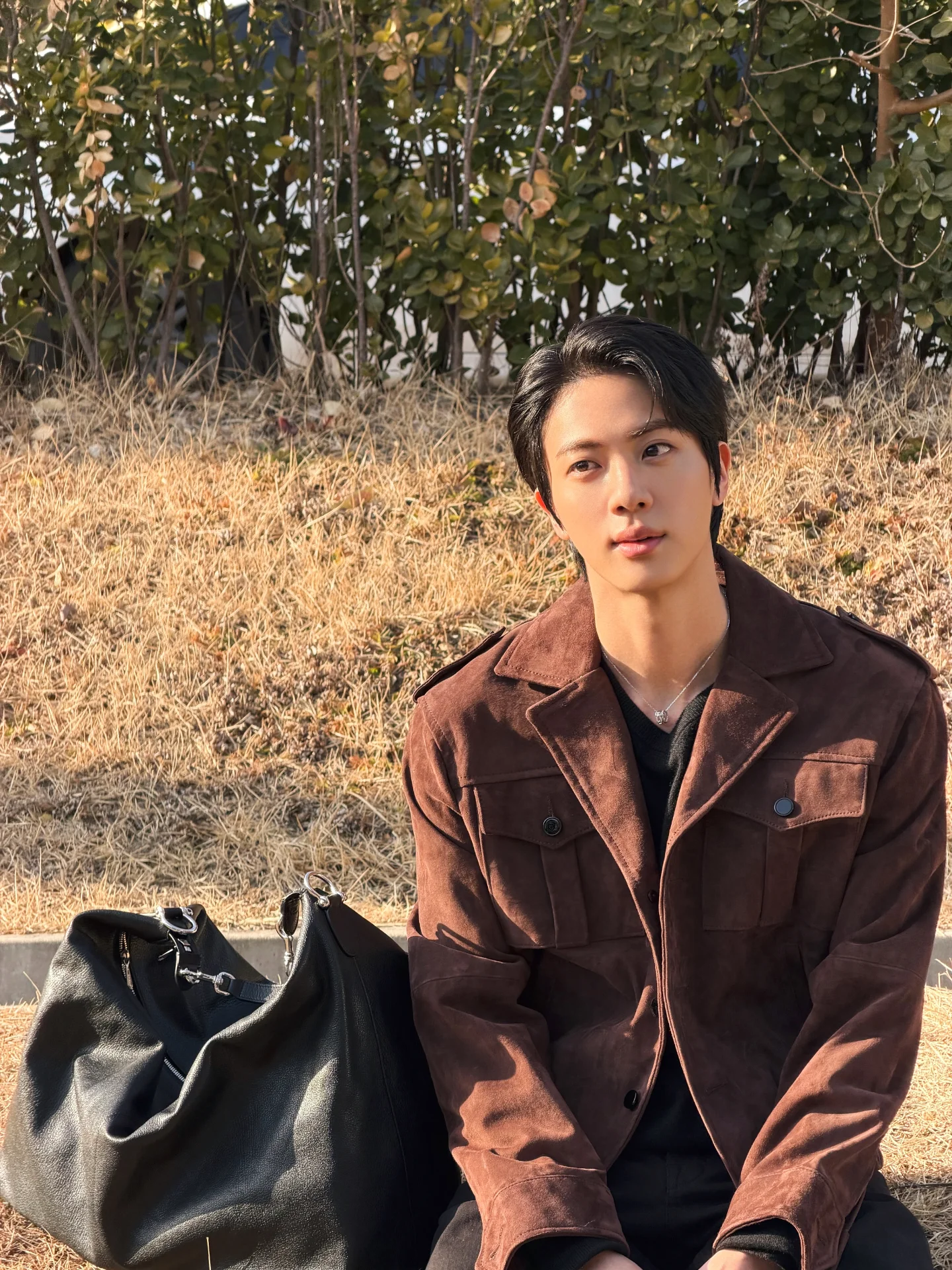 写真には、野原に直接座っているJINの姿が収められている。