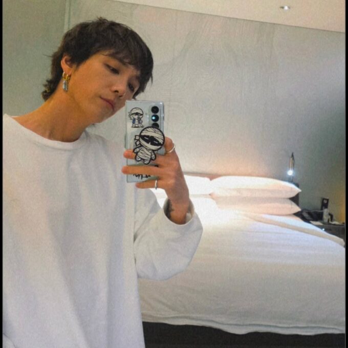 写真には、寝室で自撮りをするホンギの姿が収められている。