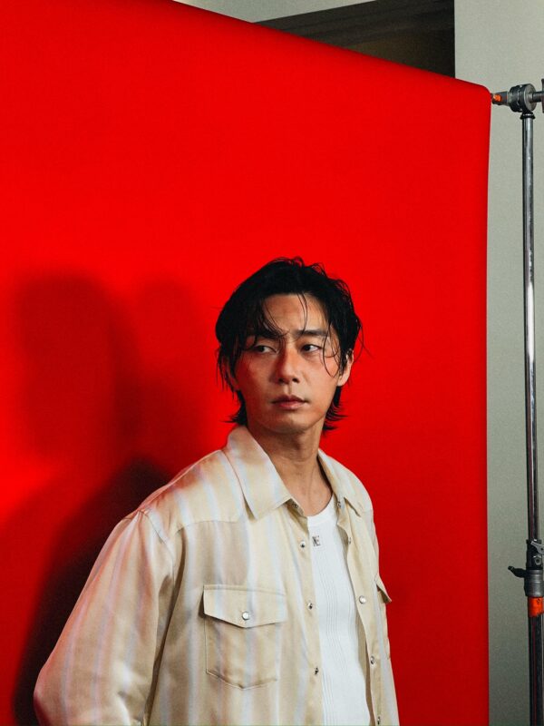 パク・ソジュンは強烈な眼差しでポーズを取り、視線を集めている。