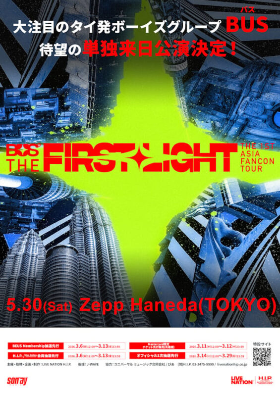 タイ国内で社会現象を巻き起こしている12人組ボーイズグループ、BUS because of you i shineが、初のアジアツアーの一環として「BUS The 1st Asia Fancon Tour : THE FIRST LIGHT IN JAPAN」を2026年5月30日(土)、Zepp Haneda(TOKYO)にて開催することが決定した。