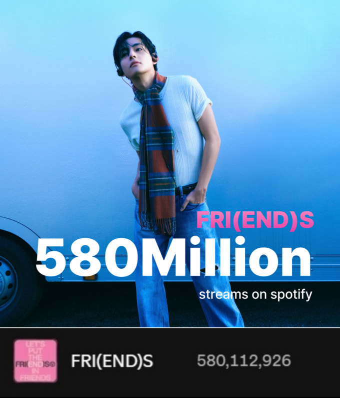 Vのソロ曲「FRI(END)S」は、世界最大の音楽ストリーミングプラットフォームSpotifyで5億8000万回再生を超えた。リリースから時間が経っても人気が衰えず、Vのソロ音楽の力を再確認させた。
