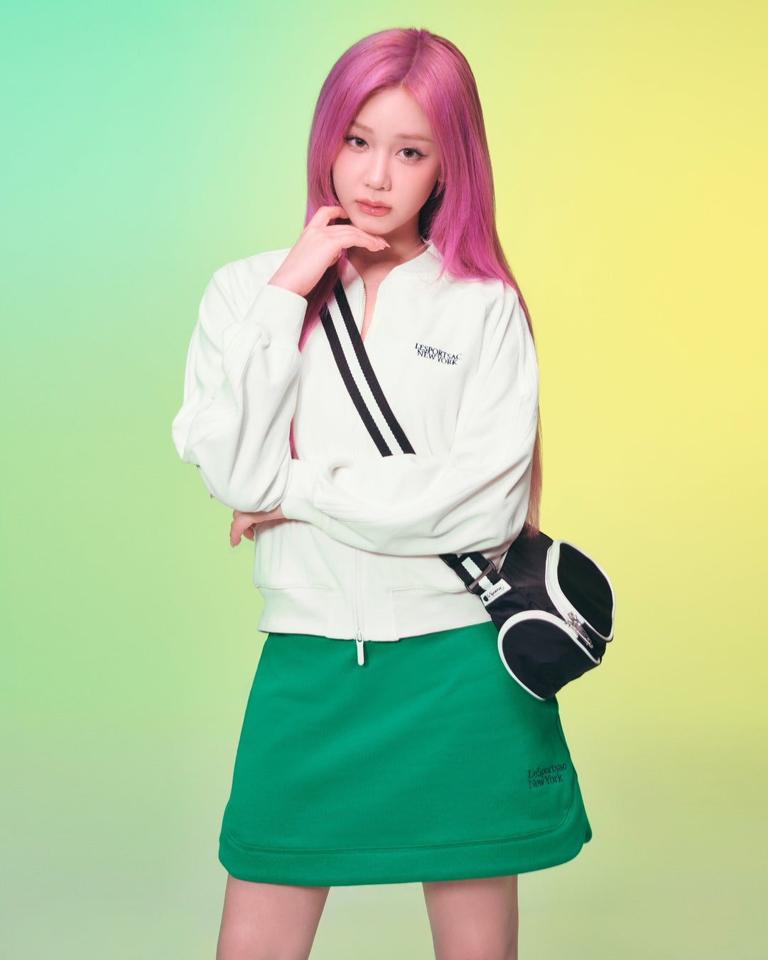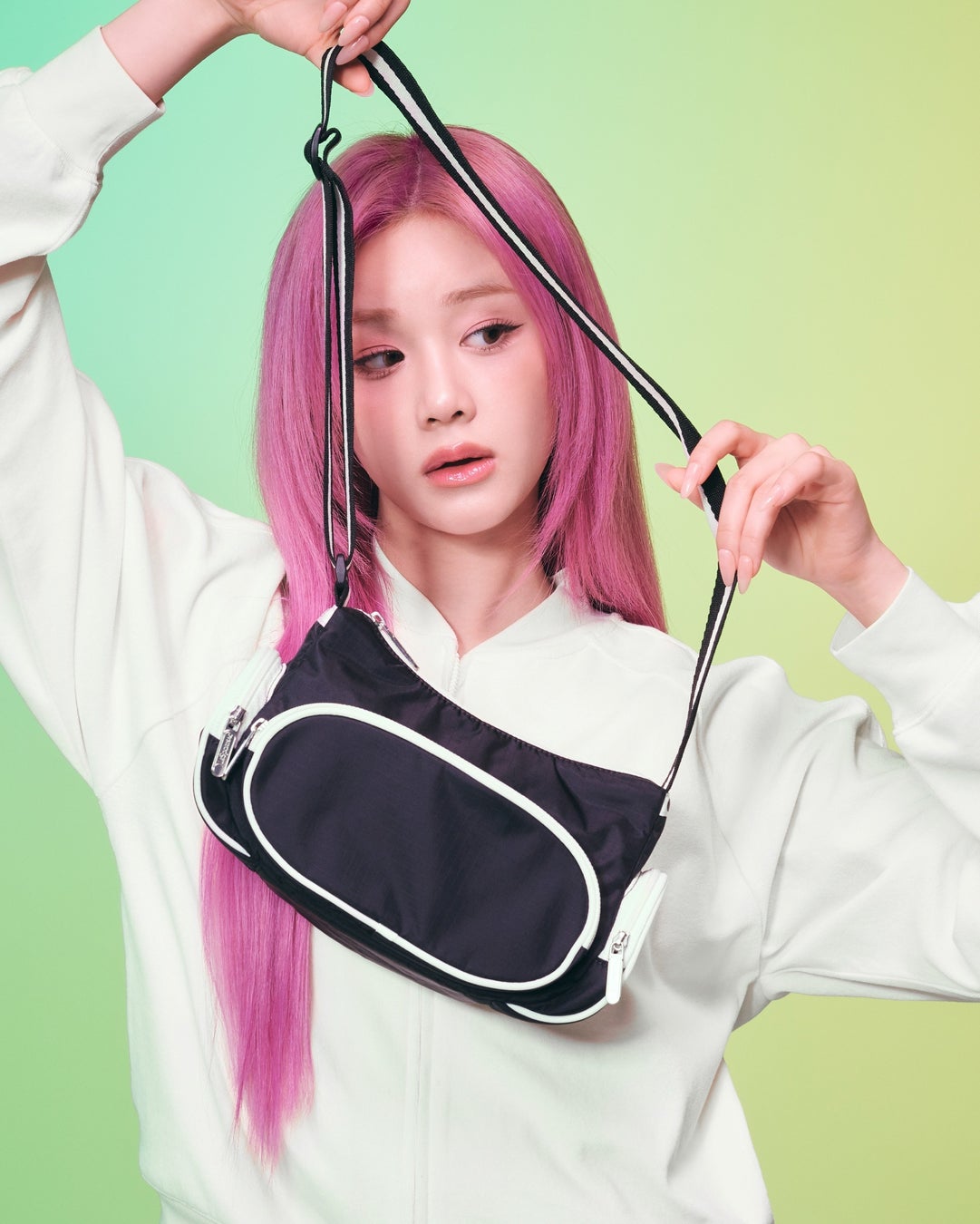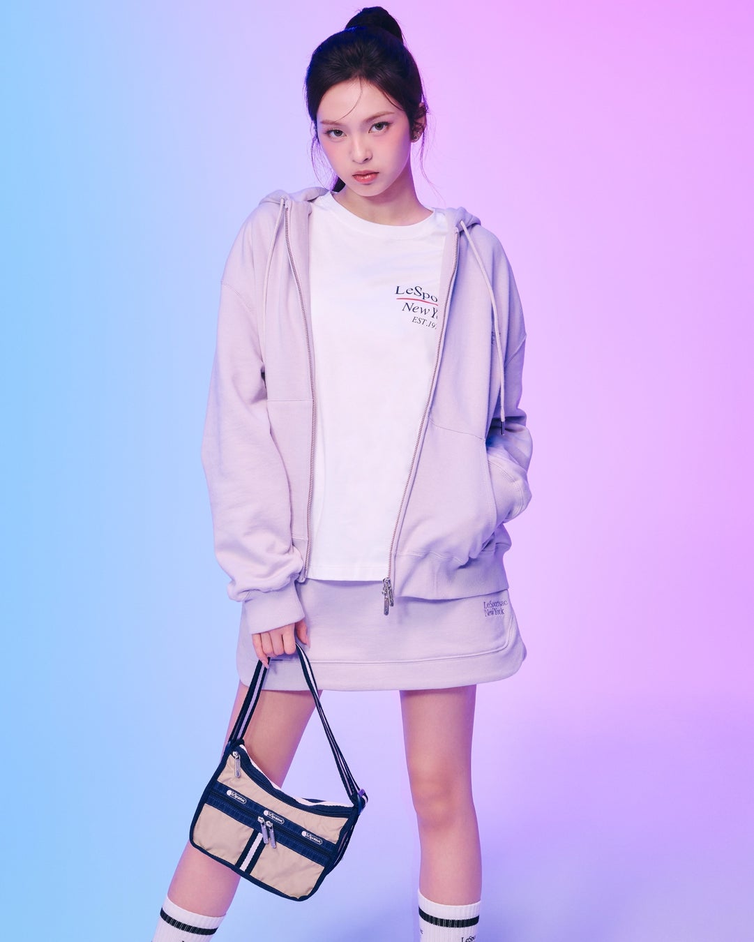 ASAはLeSportsacを象徴するリップストップナイロンのアノラックを主役にしたスタイル、RUKAとRORAはクールでスポーティなパンツスタイル、PHARITAとAHYEON、CHIQUITAはグリーンやラベンダーのカラーを効かせたスウェットスタイルで登場します。
