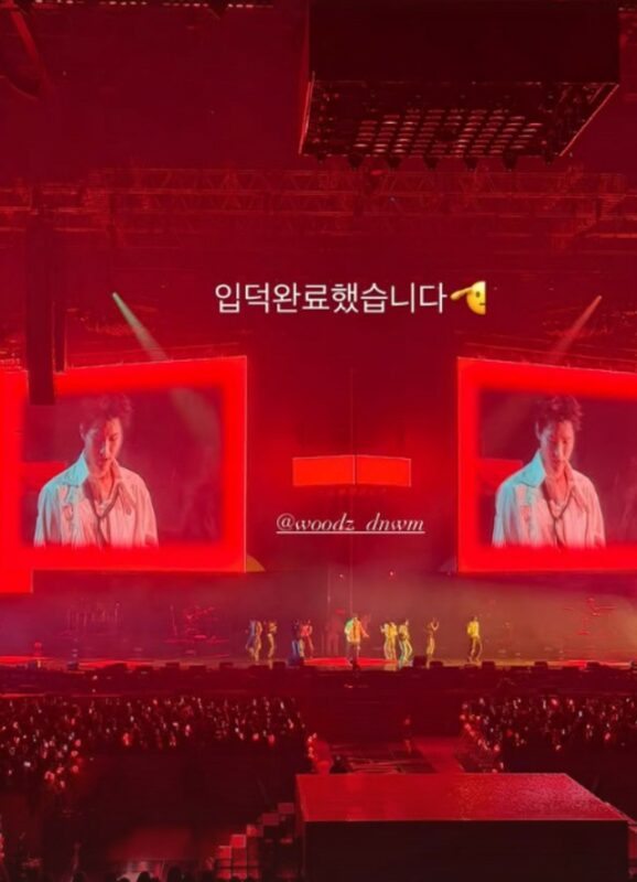 公開された写真には、WOODZが赤いライトの下、コンサート会場で公演する姿が写っている。