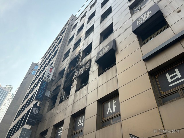 ソウル・ミョンドン(明洞)の7階建てのビル。先週末、このビルの3階にあるカプセルホテルで火災が発生した。外側についている窓は黒焦げに焼けてしまっており、道には相変わらず焦げたにおいが漂っていた。火災が発生した日、宿に荷物を預けた宿泊客は、住民センターで名簿を確認した後、警察や区役所関係者に案内されて軍手と特殊マスクを着けて宿の中に入った。