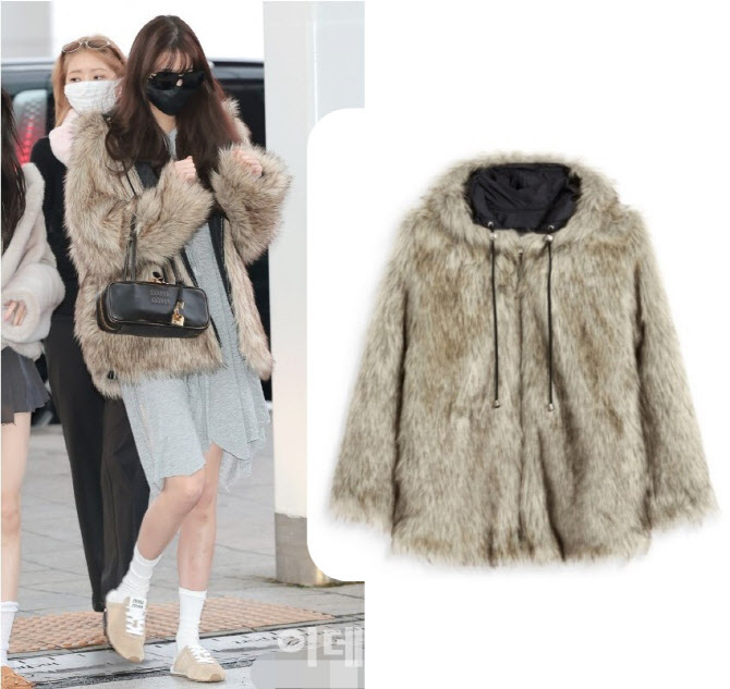 このときのファージャケットは「OPEN YY」の「エコファー・リバーシブルジャケット」で、価格は43万8000ウォン(約4万4000円)。裏返して黒いアウターとしても着用できるのが特徴だ。