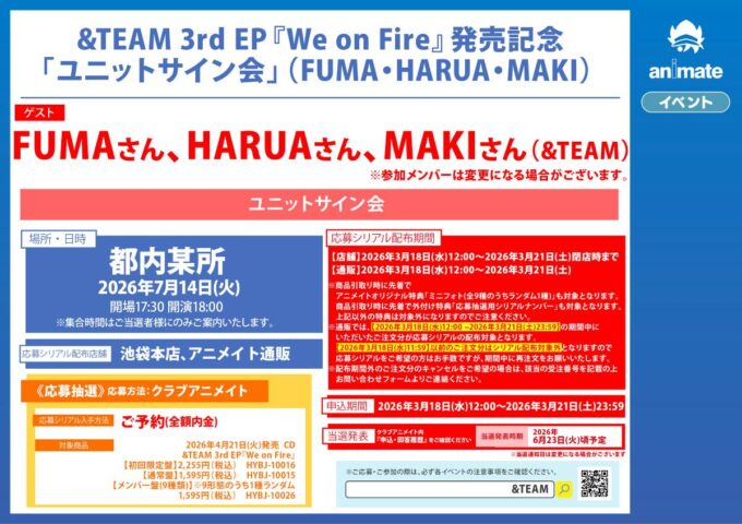 株式会社アニメイトは、2026年7月14日に【&TEAM 3rd EP『We on Fire』発売記念「ユニットサイン会」(FUMA・HARUA・MAKI)】を開催いたします。