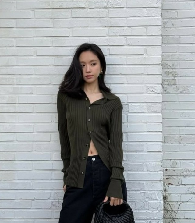 写真の中の彼女はカーディガン姿で、ちらりとおへそが見えるスリムなウエストラインが視線を引き付ける。
