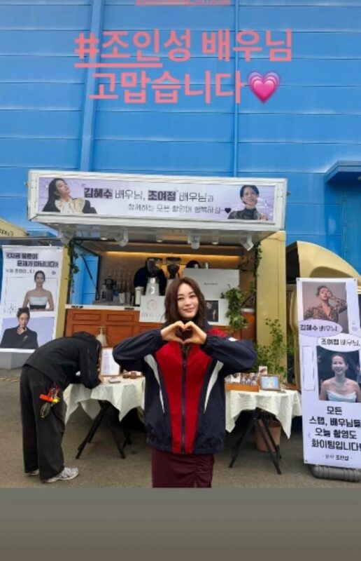 今回共に公開された写真には、俳優のチョ・インソンが応援のために送ったコーヒーカーの前で、ポーズを取っているキム・ヘスとチョ・ヨジョンの姿が収められている。