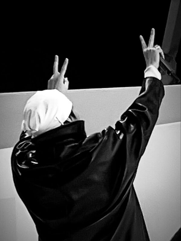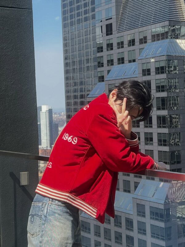 写真には、ネイビーのパーカーを着たVの姿が収められている。