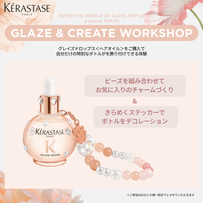 プロフェッショナル・ラグジュアリーヘアケアブランド「ケラスターゼ」は、新製品「グロスアブソリュ」の発売を記念し、4月8日(水)〜14日(火)の7日間「@cosme TOKYO」にてポップアップイベントを開催いたします。会場内では、話題のヘアオイル「グレイズドロップス」を含む「グロスアブソリュ」シリーズ全製品をお試しいただけるほか、製品をご購入いただいたお客様限定のオリジナルアクセサリー制作など、特別な体験をお楽しみいただけます。