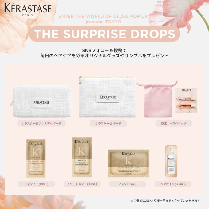 公式Xフォローやイベントの投稿をしていただいた方にはケラスターゼからの「サプライズ・ドロップ」を。お試しサイズの製品や限定オリジナルグッズなど、何が当たるか分からないワクワク感とともに、ラグジュアリーなギフトをお受け取りください。