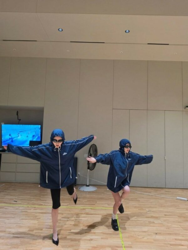 公開された写真で彼女はユンジンと一緒に、今月22日に「BTS」がアメリカへ出国する際に着ていたネイビーカラーのウインドブレーカーのフードを目深にかぶり、水泳用のゴーグルまで着け、今にも水しぶきを切り裂いて進んでいきそうな水泳のポーズを取った。