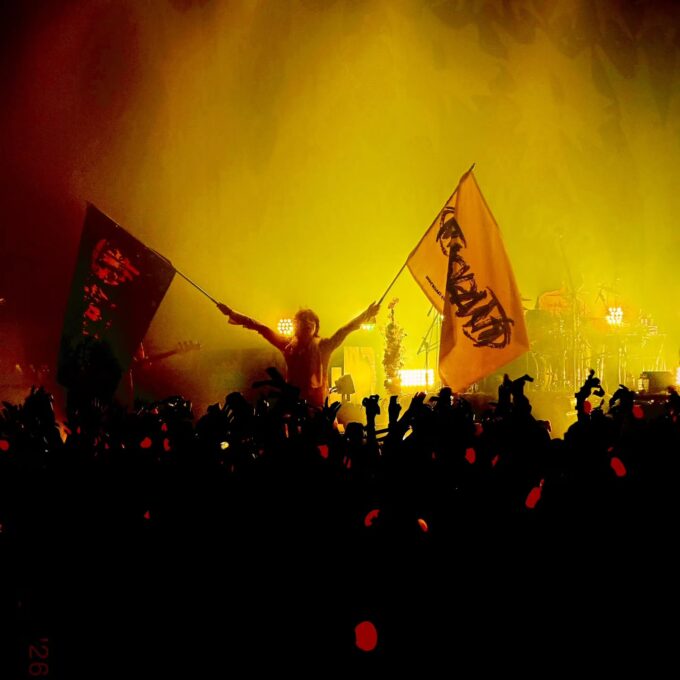 写真には、ステージ上で両手にそれぞれ大きな旗を掲げているホンギの姿が収められている。