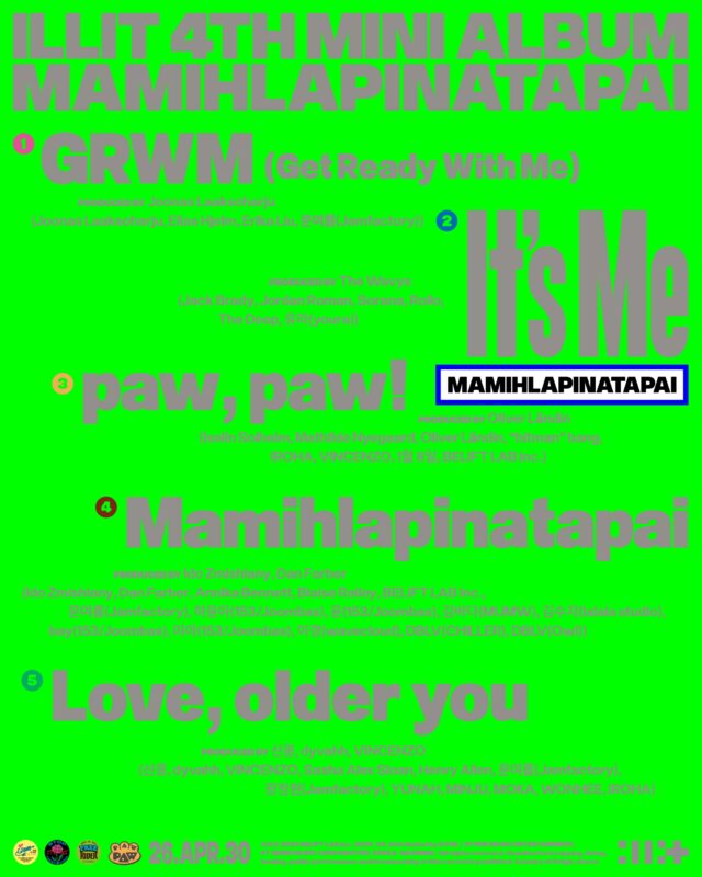 ILLIT(YUNAH、MINJU、MOKA、WONHEE、IROHA)は、3月31日正午にHYBE LABELSの公式YouTubeチャンネルで4th Mini Album ‘MAMIHLAPINATAPAI’ (マミラピナタパイ) のトラックリストを公開した。これによると、本作にはタイトル曲「It’s Me」をはじめ、「GRWM (Get Ready With Me)」、「paw, paw!」、「Mamihlapinatapai」、「Love, older you」の全5曲が収録される。