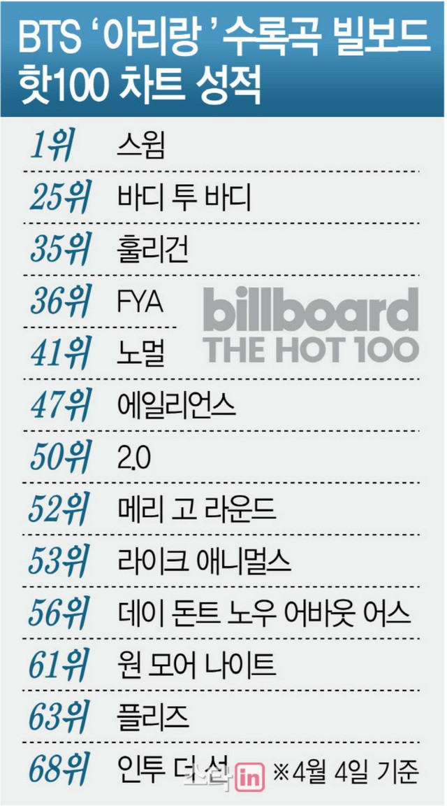 何よりもビルボード2大アルバムチャートであるビルボード200とシングルチャートHOT100で1位を席巻した点が目に付く。「BTS」は「ARIRANG」で自己最高アルバム販売量の記録を更新し、ビルボード200で1位になったことに続き、タイトル曲「SWIM」でHOT100の首位まで獲得した。歌詞はなく、聖徳大王神鐘の音で満たされたインタールードトラック「No.29」を除いた13曲がHOT100にチャートインし、人気を誇った。