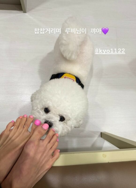 今回公開された写真には、ソン・ヘギョの愛犬ルビーが、チョ・ヨジョンの足元で愛情を見せている姿が収められている。