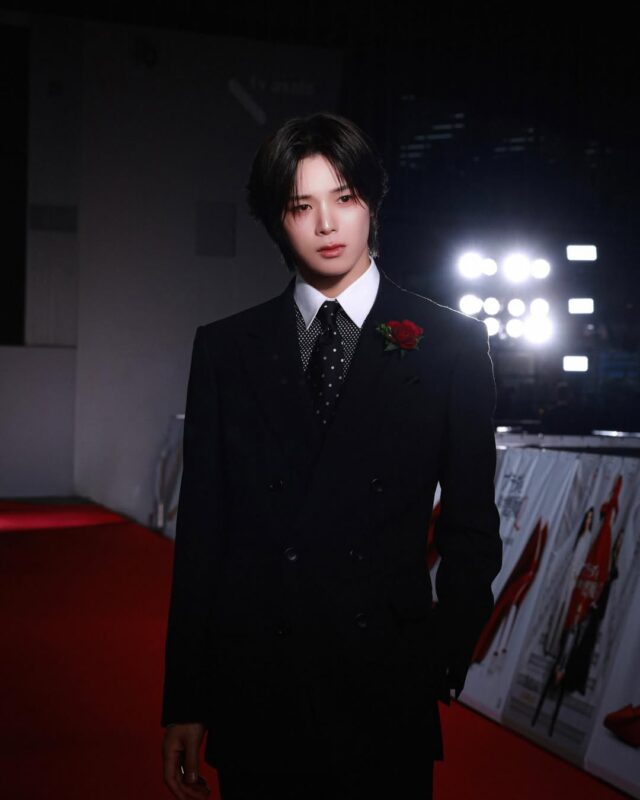 写真には、オールブラックのスーツスタイルに身を包んだKの姿が収められている。