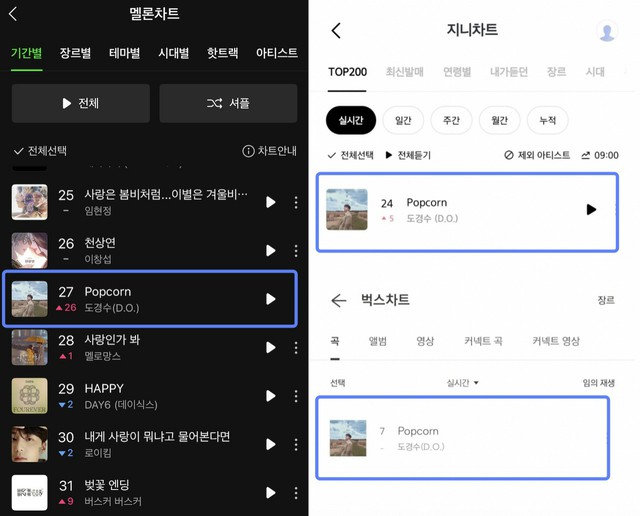 D.O.の「Popcorn」は、最近Melonのリアルタイムチャートにランクインして再ブレイクを巻き起こし、6日にはMelonのデイリーチャート27位に定着して話題を集めた。リアルタイムチャートの上位を席巻しただけでなく、Melonの人気選曲検索トレンドや期間別チャートにも名を連ね、FLOチャート2位、Bugsチャート7位、Genieチャート24位など、各種音楽配信サイトでも同時にランクインし、プラットフォームを問わず人気が上昇していることを証明した。