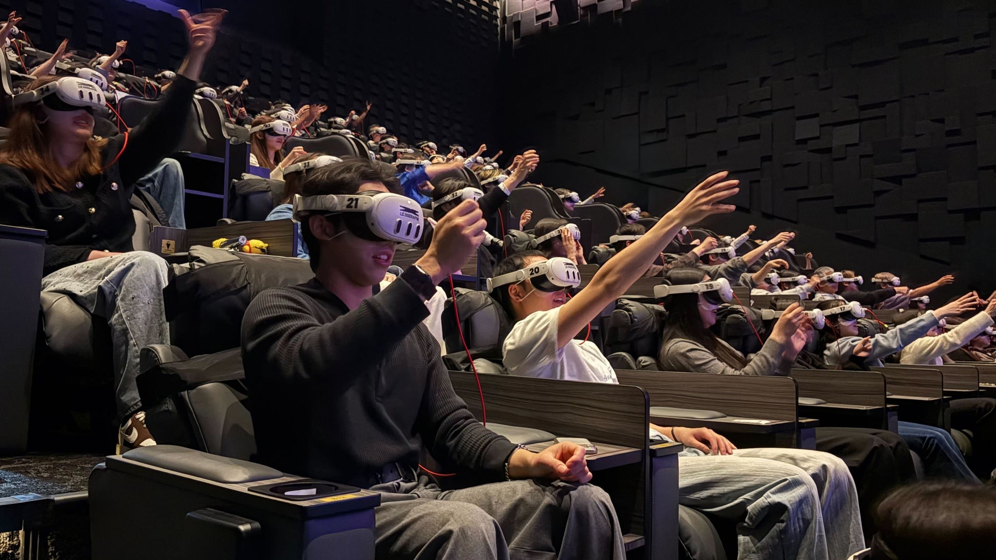 本VRコンサートでは、映画館の座席に設置されたVRヘッドセットを着用することで、目の前に広がる12Kの高精細な映像と、映画館の7.1ch(※1)サラウンドシステムによる高品質な音響環境で、臨場感あふれる体験をお楽しみいただくことができます。手が届きそうな“最前列以上の近さ”までアーティストが迫ってくる圧倒的な迫力と、リアルに再現されたバーチャル空間の中で、まるで自分だけのためにパフォーマンスをしてくれているかのような、他では味わえない没入感が味わえるのが魅力です。