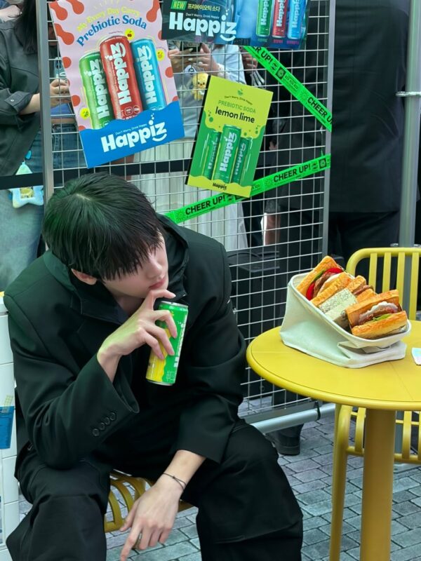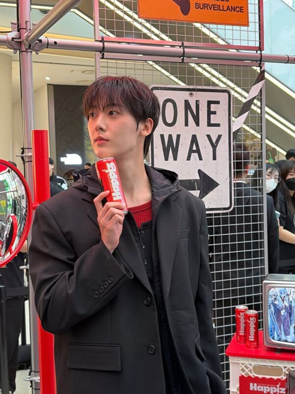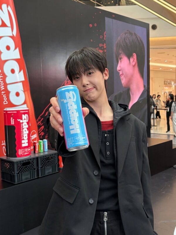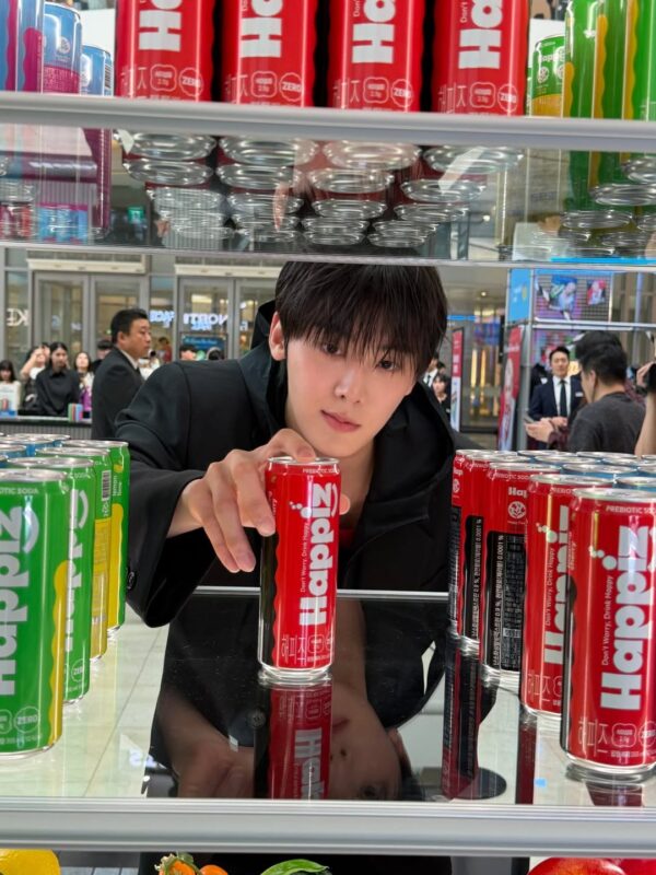 公開された写真には、ロッテ七星飲料のプレバイオティクスソーダ「Happiz」のイベント会場を訪れたユンサナの姿が収められている。黒のジャケットに赤いインナーを合わせたスタイリッシュな装いで、新商品を手にポーズを決めたり、巨大な缶のオブジェを抱える姿が写っている。