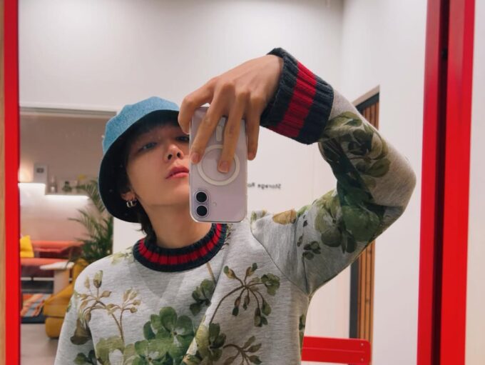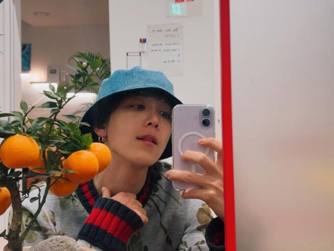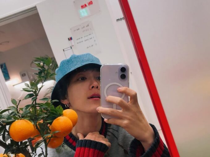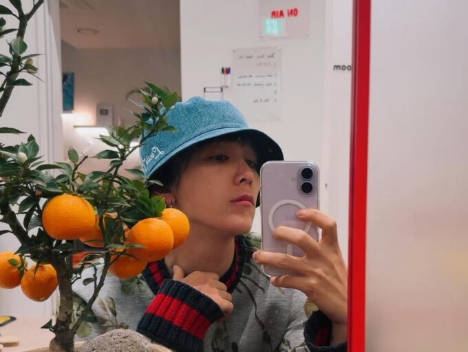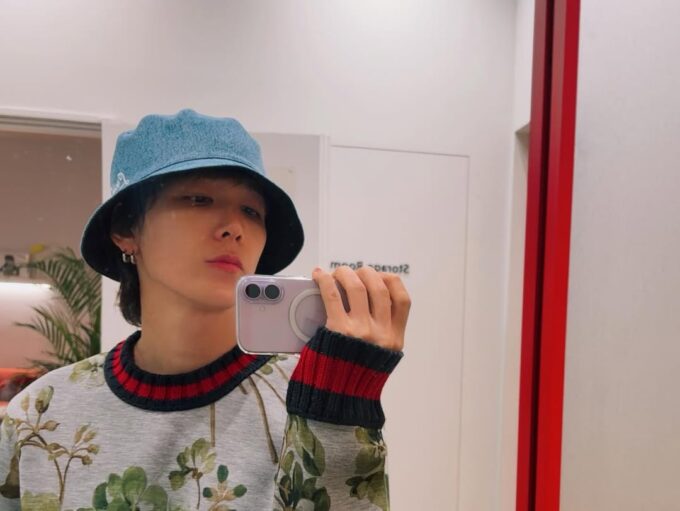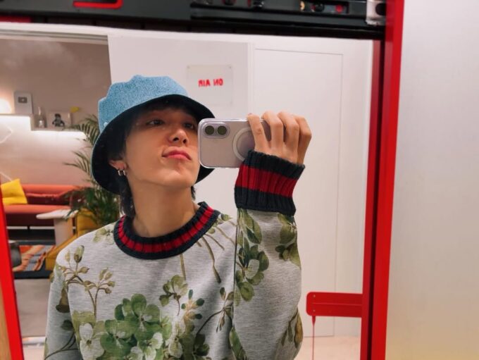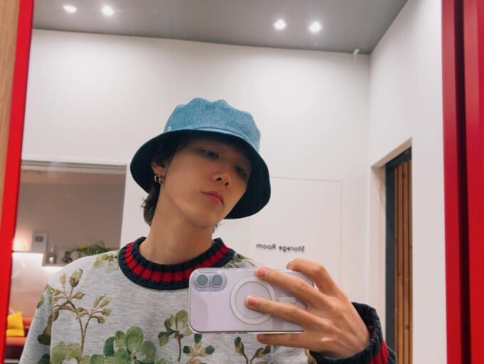 ホンギはブルーのバケットハットをかぶり、ミラーセルカを撮っている。