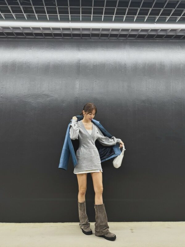 今回公開された写真の中で、ユン・ウネは深いVネックラインが特徴のグレーのニット素材ミニワンピースにロングブーツを合わせている。ワンピースはウエストラインがしっかりと作られており、スリムなスタイルを際立たせている。