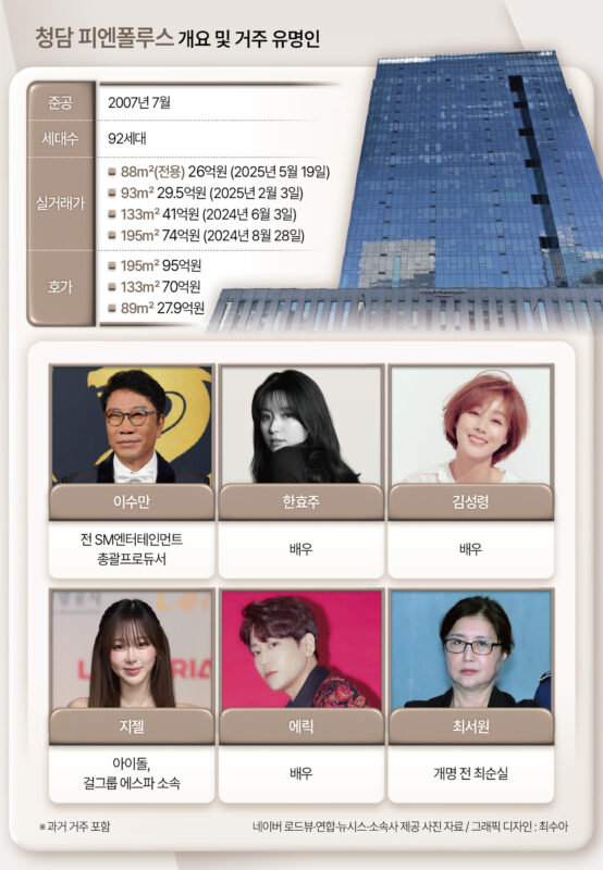 同物件は“芸能人オフィステル”としても名を馳せてきた。歌手エリックやタク・ジェフンが所有していたほか、ハン・ヒョジュも居住していたとされる。さらに2024年末にはキム・ソンリョンが138平方メートルの住戸を41億ウォン(約4億1000万円)で購入し、当時の最高額を更新した。