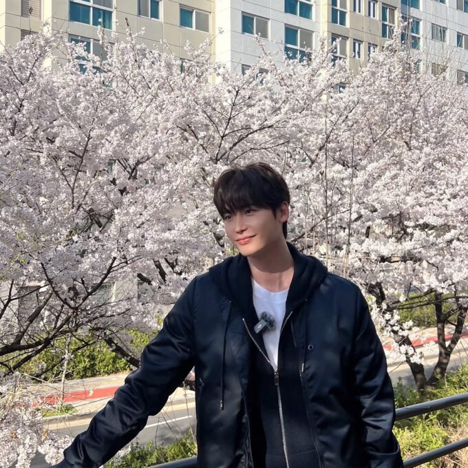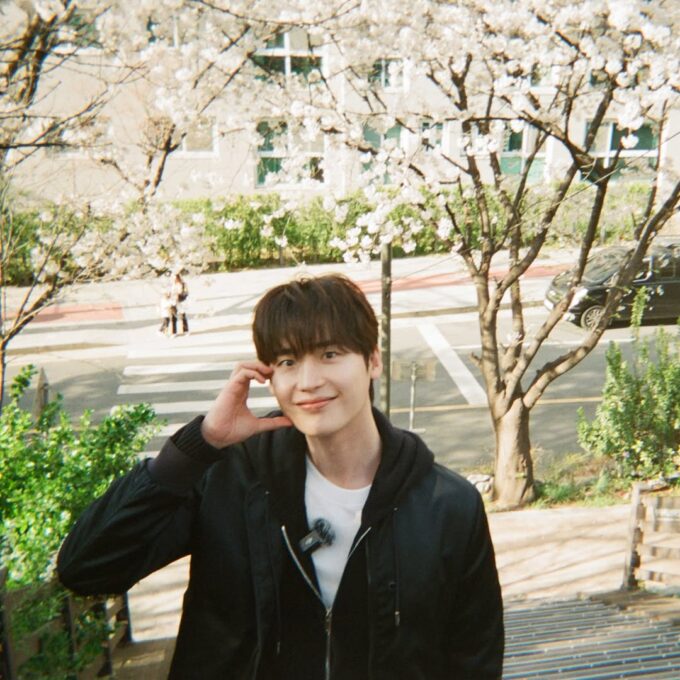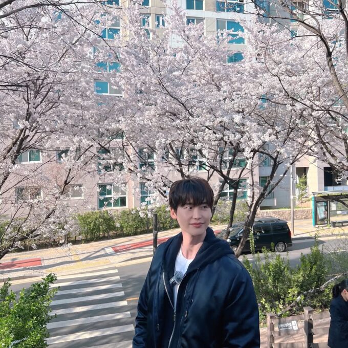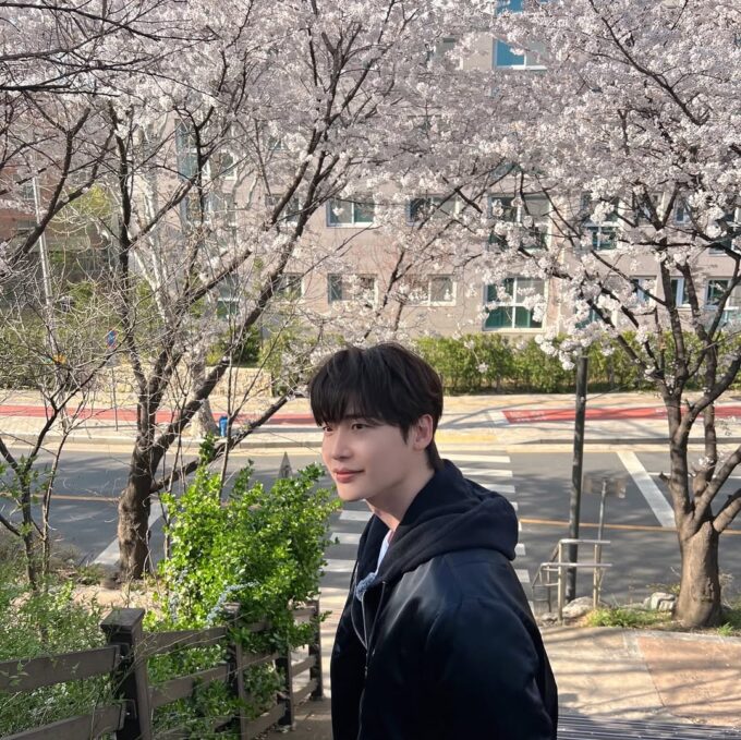 公開された写真には、桜並木を背景にカメラに向かってポーズを取るイ・ジョンソクの姿が収められている。