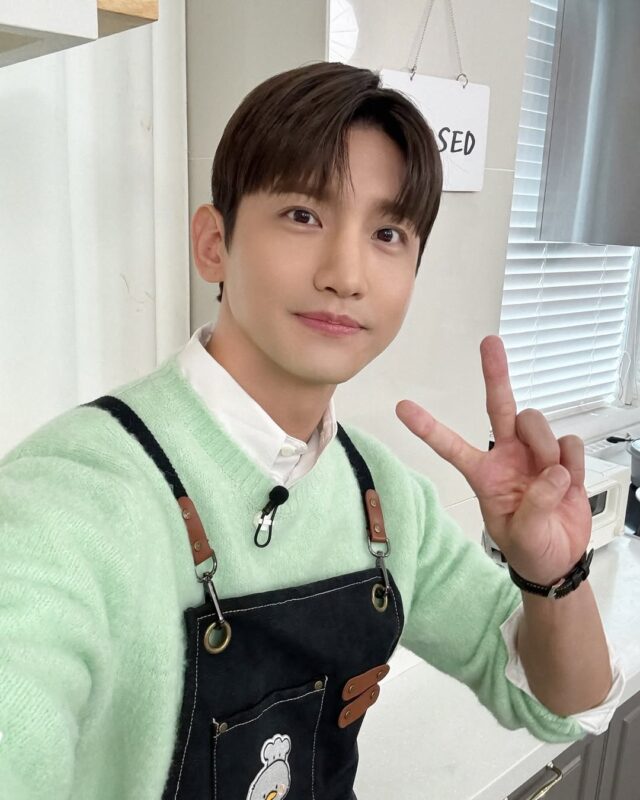 写真には、エメラルドグリーンのニットを着てエプロンをかけたチャンミンの姿が収められている。