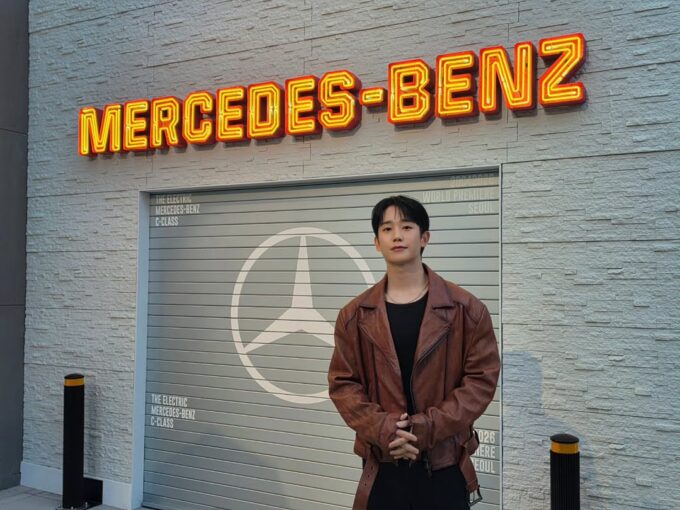 また、スタイリッシュな車と一緒に写った写真や、メルセデス・ベンツのロゴを背景に立つ写真なども公開され、イベントの雰囲気を伝えている。