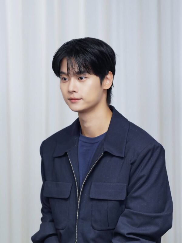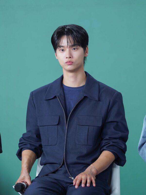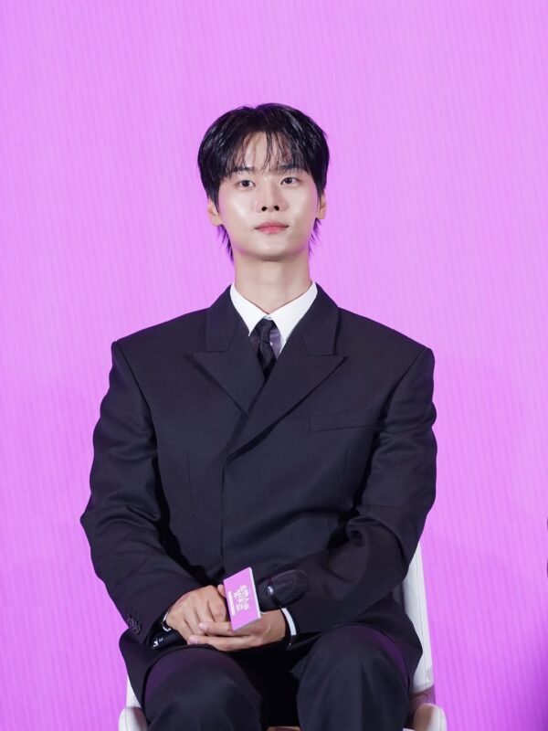 公開された写真には、ネイビーのスーツスタイルでインタビューに答えているエンの姿が収められている。