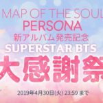 ポノス株式会社は同社のスマートフォン向けリズムゲームアプリ『SUPERSTAR BTS』において、BTS最新アルバム「MAP OF THE SOUL : PERSONA」の販売を記念したイベント『SUPERSTAR BTS 大感謝祭』を2019年4月18日(木)17:00より開始いたしましたので、こ…