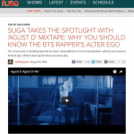 アメリカの有力媒体であるFUSE TVが、人気アイドルグループ防弾少年団のSUGAの初のミックステープを分析した記事を掲載した。 16日(現地時刻)FUSE TVは「SUGA TAKES THE SPOTLIGHT WITH 『Agust D』 MIXTAPE:WHY YOU SHOULD KNOW…