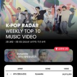 BTS(防弾少年団)が、再びK-POPレーダーチャートの1位を奪還した。 BTSの「Dynamite」のミュージックビデオは、K-POPレーダーの2021年10週目(2月28日〜3月6日)のチャートで1,457万ビューを記録して再びトップに立った。 こうしてBTSは、「Dynamite」を通じて通算…