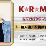 カラムが韓国で出演する舞台『⼀級⼈間』千穐楽をみんなで観劇しよう!カラムと韓国で特別な時間を過ごすツアーが決定! 韓国で舞台で活躍中のカラムが、11 ⽉に韓国ソウルの⼤学路で出演が決定した舞台『⼀級⼈間』の千穐楽を観劇するほか、リハーサルに潜⼊したり(4 ⽇間コースのみ)、カラムと⼀緒に打ち上げした…